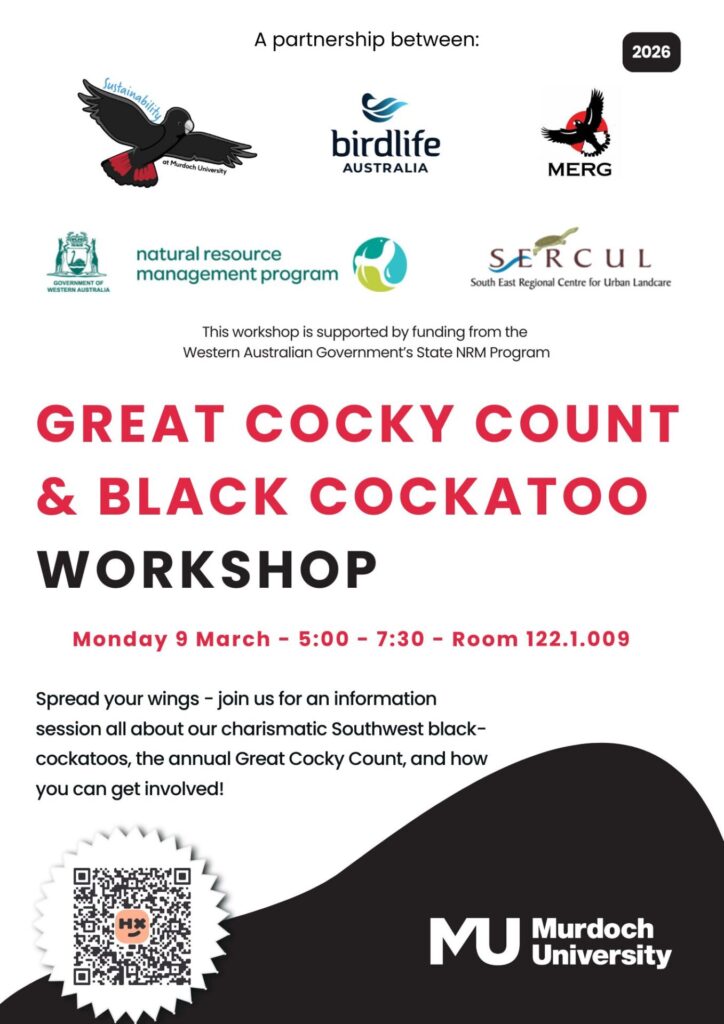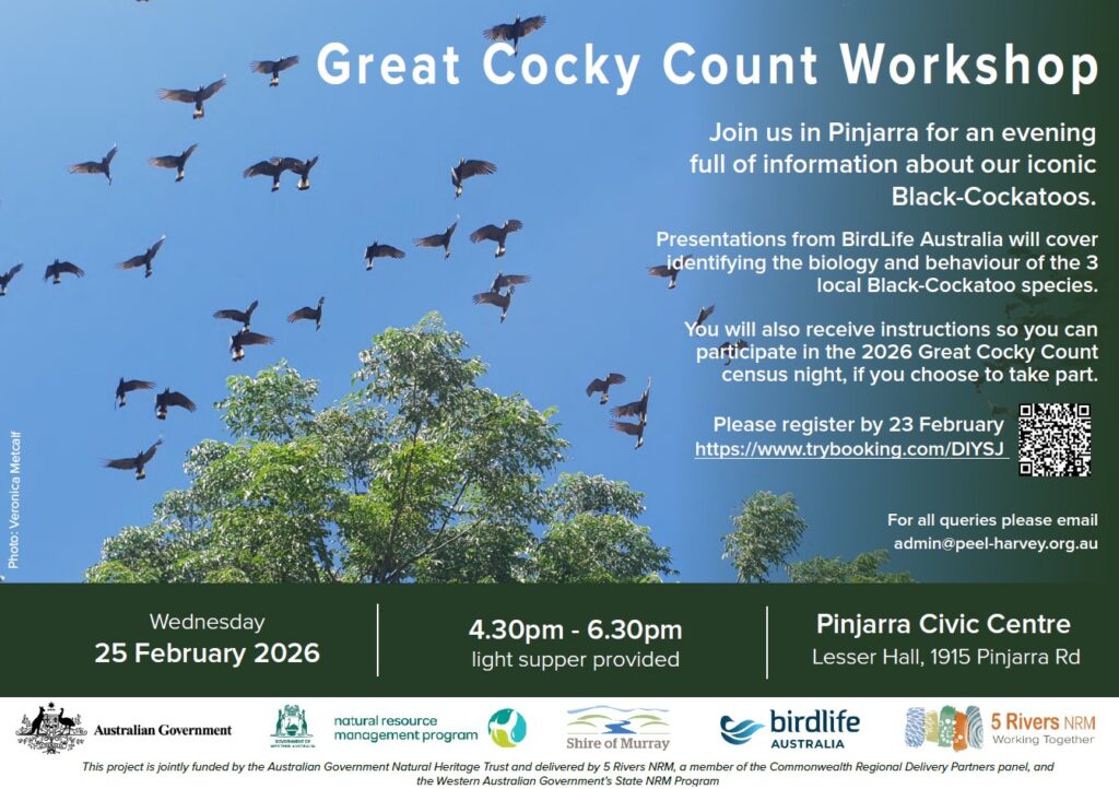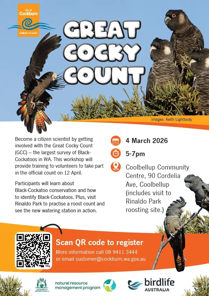 Birdlife Australia will be holding free workshops around Perth and in regional centres across southwest WA in the lead up to the Great Cocky Count. The workshops will bring the world of black-cockatoos to life, identify the threats they face, and show how people can get involved in the Great Cocky Count and take other actions to support black-cockatoos. Follow the links and flyers below for more details and to register.