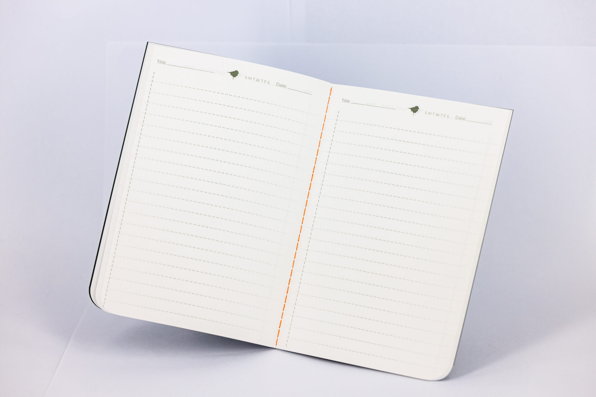 Thread-bound with an orange cotton spine, the cover features embossed LYFER detailing and the Birdmark, finished with subtle foiling. Inside, lined pages include space for date, day, and title to keep observations organised.