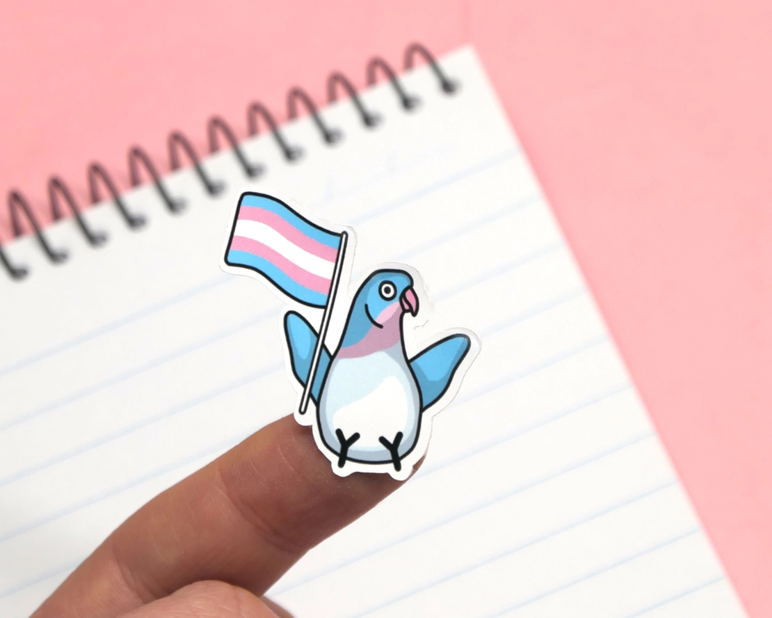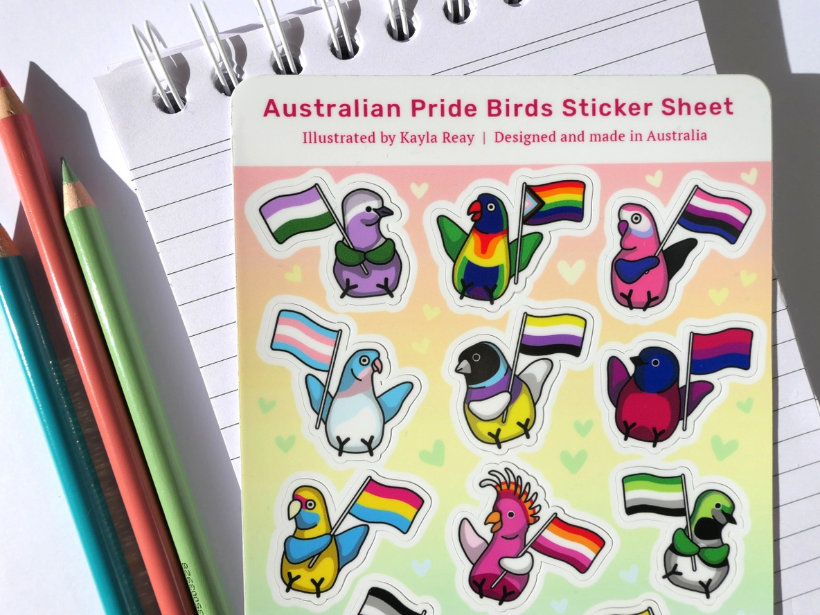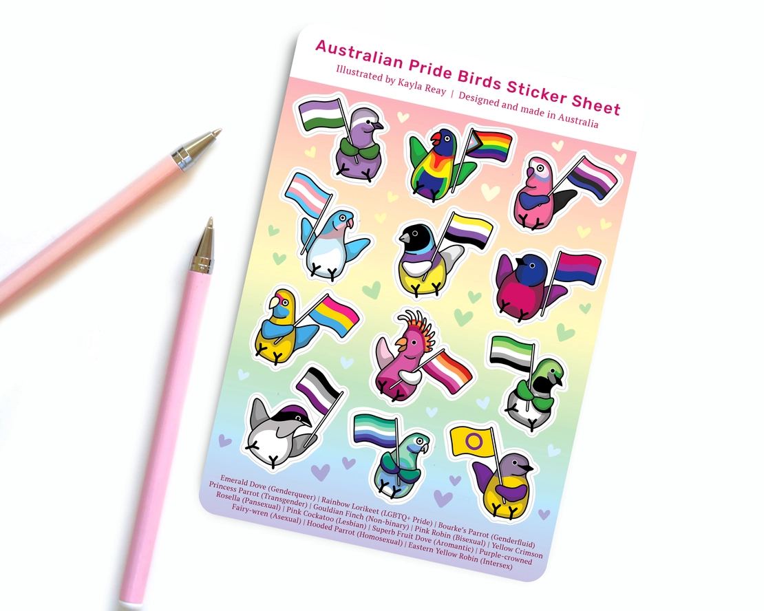 This vinyl sticker sheet features illustrations of Australian birds holding pride flags that match their colours.