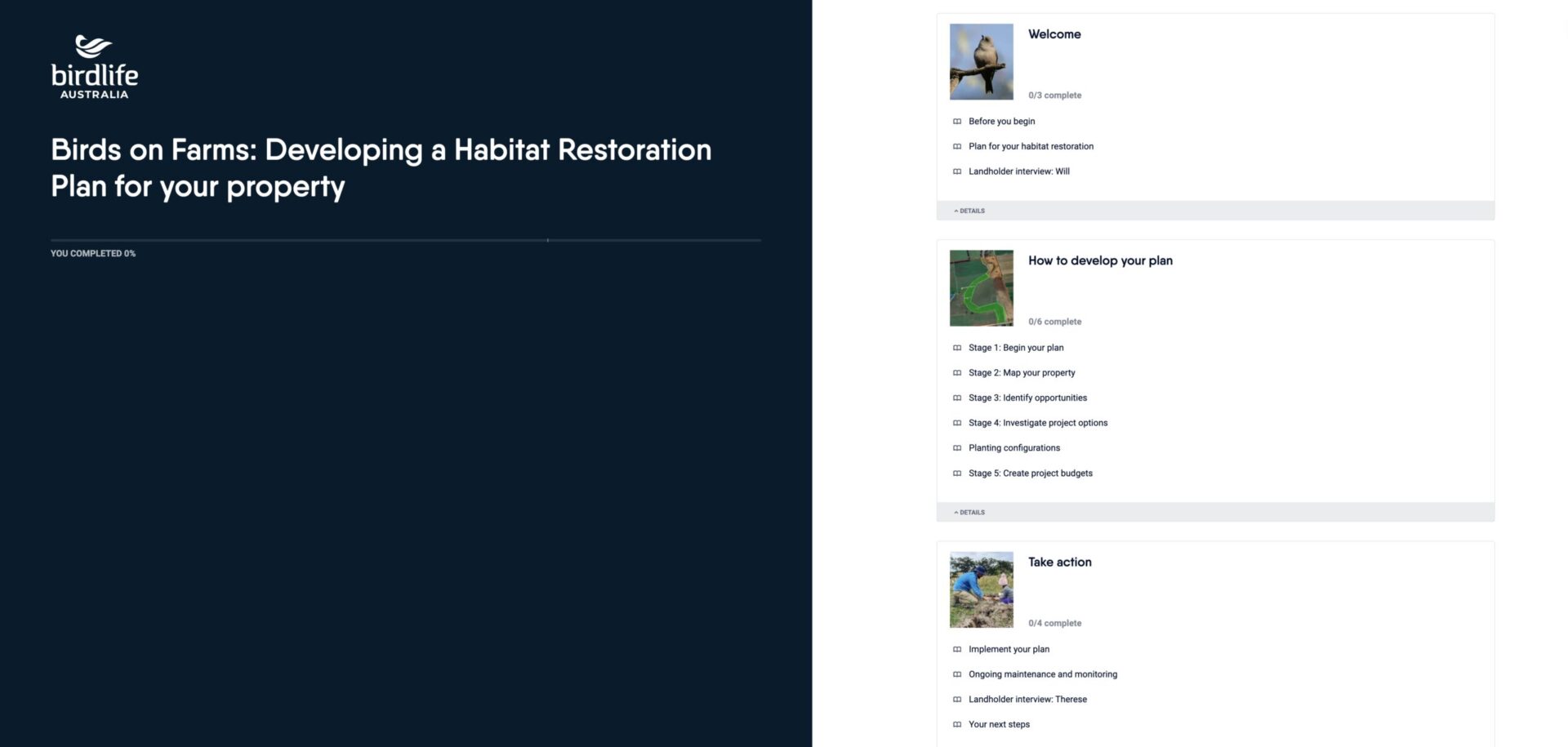 This course provides more tailored advice than the first course, Birds on Farms: Creating a bird-friendly property. You’ll have direct access to the Birds on Farms team for more support to create and implement your habitat restoration plan. The forum is also a great place to share your ideas and questions with peers.