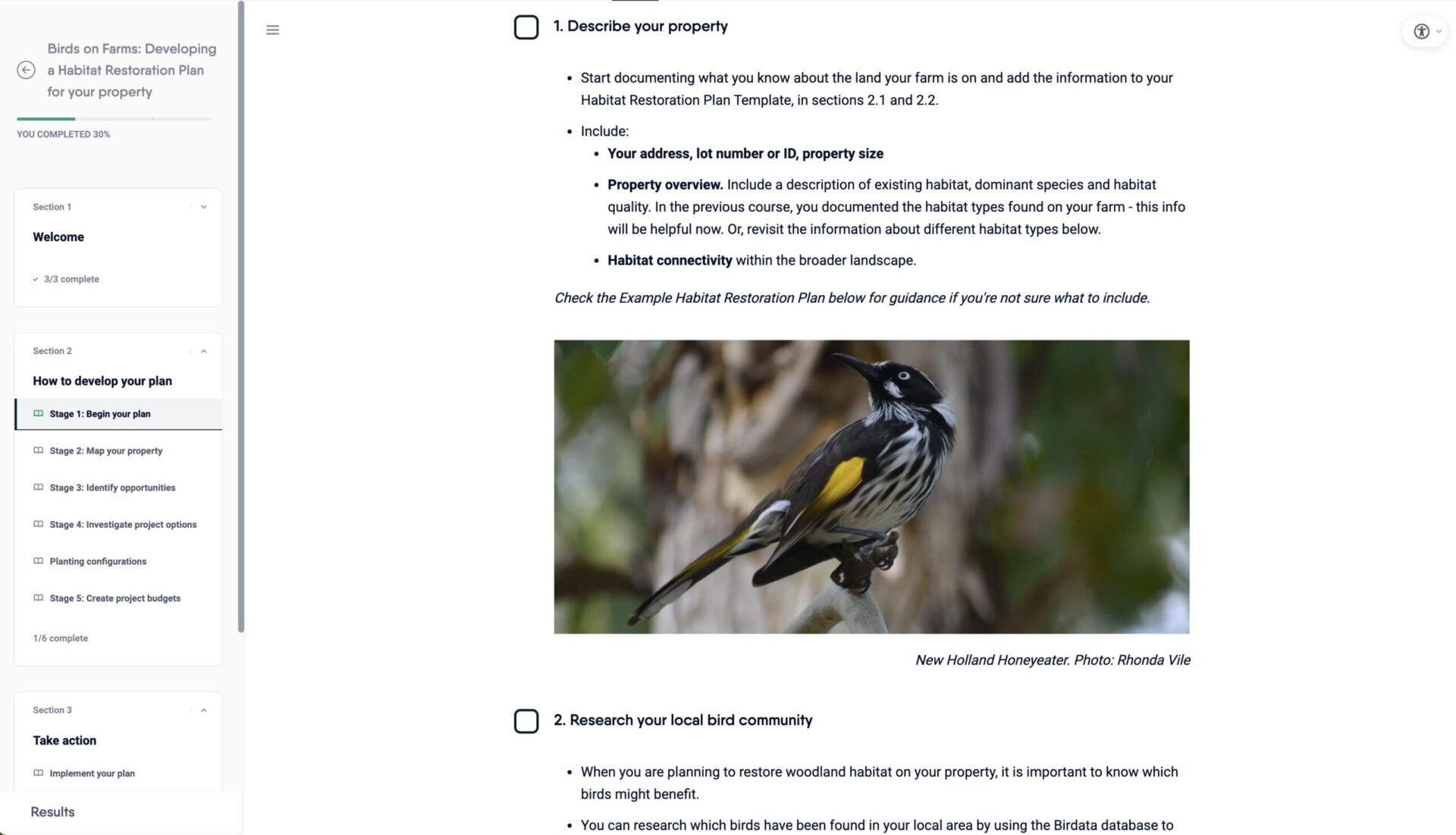 Approximately 2 hours to work through the course content. You will require additional time to research your property, local birds and plants, and to map your property, gather quotes, prepare budgets and materials lists, and put it all into action.