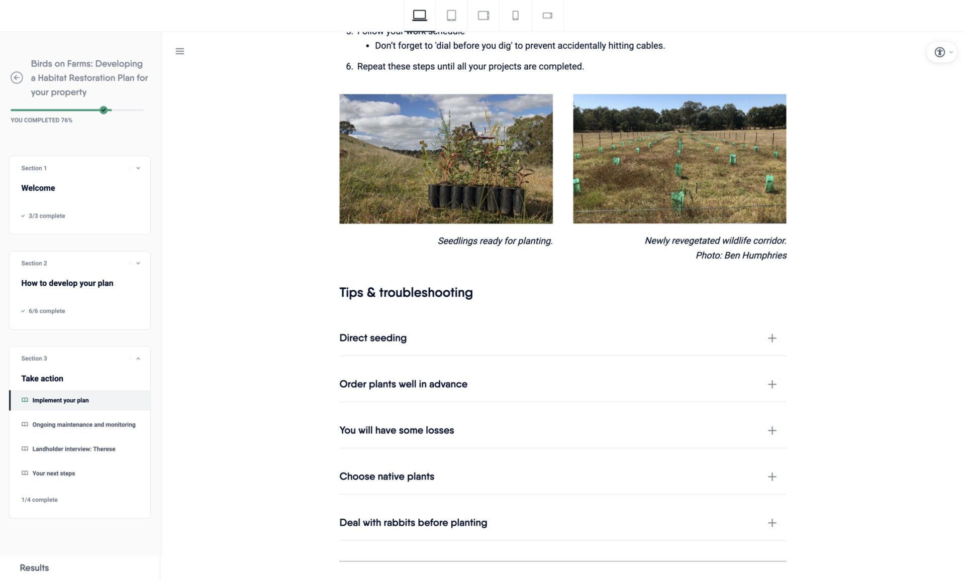 After you’ve finished the course, you’re welcome to revisit it as often as you need while you implement your habitat restoration projects.