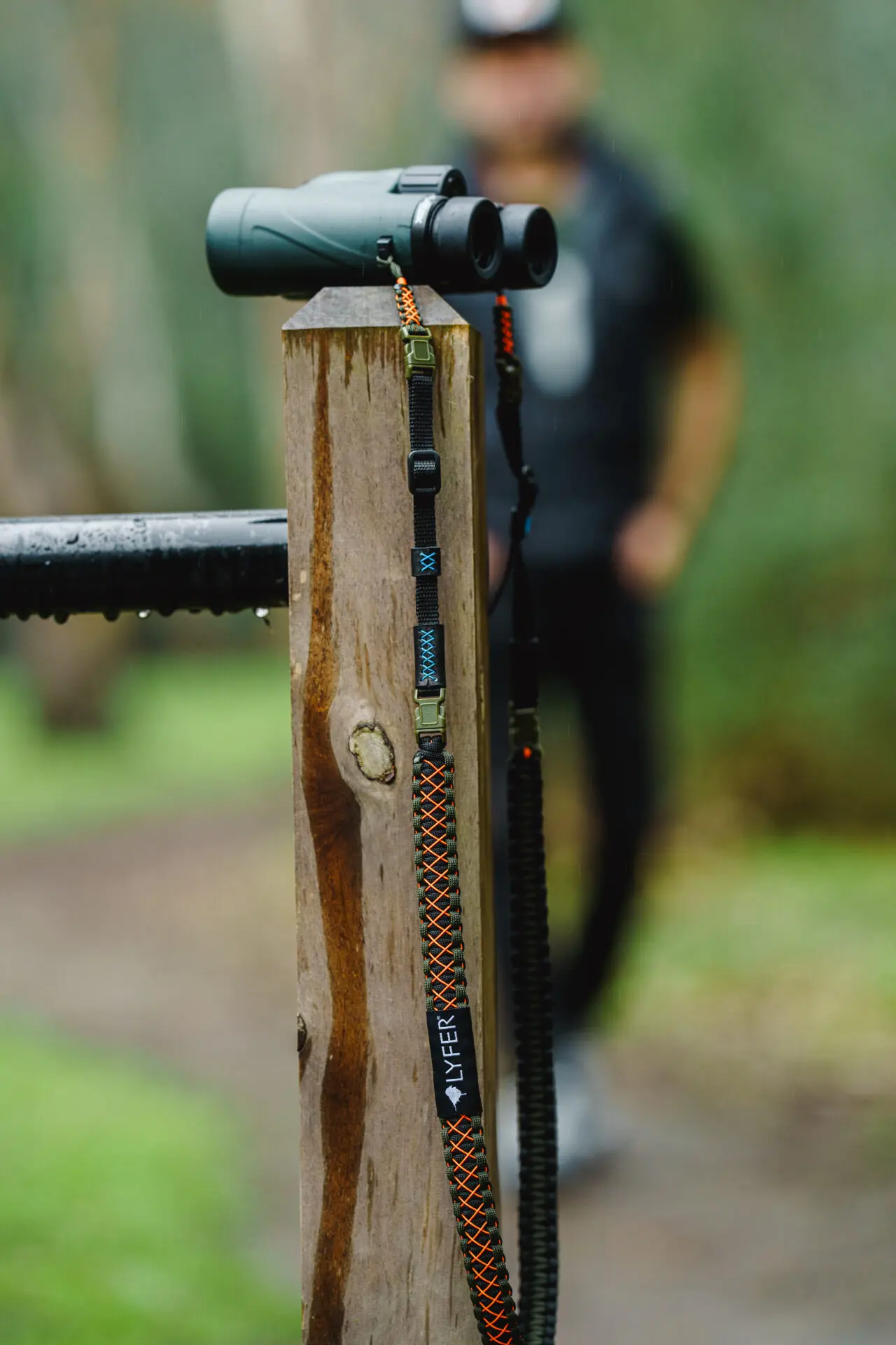 Made from premium paracord, finished with vegan leather and signature LYFER detailing, it’s built for outdoor use but designed to stand out. Fitted with strong, secure hardware and quick-release clasps, each strap is adjustable for comfort and compatible with most binoculars and cameras. A practical upgrade with purpose
