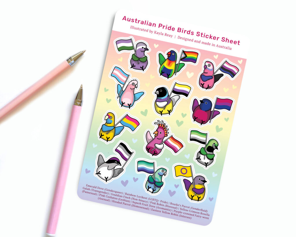 Australian Lgbt+ Pride Birds Vinyl Sticker Sheet $8.00 https://birdlife.org.au/product/australian-lgbt-pride-birds-vinyl-sticker-sheet/ Sheet Size: 17 x 12cm (each sticker is sized roughly between 3cm and 4cm). Designed by queer Australian artist Kayla Reay The Australian birds and matching pride flags represented on this sheet are: Emerald Dove (Genderqueer), Rainbow Lorikeet (LGBTQ+ Pride), Bourke’s Parrot (Genderfluid), Princess Parrot (Transgender), Gouldian Finch (Non-binary), Pink…Read more