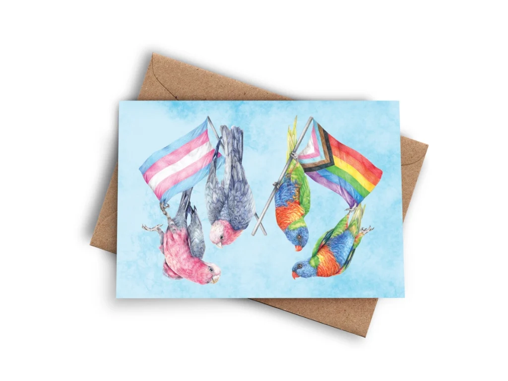 Lgbt+ Queer Pride Greeting Card – Australian Birds and Flags $7.50 https://birdlife.org.au/product/lgbt-queer-pride-greeting-card-australian-birds-and-flags/ Queer Australian artist Kayla Reay’s Pride Greeting Card features their vibrant hand-illustrated artworks of Australian birds holding LGBT+ pride flags. This card specifically features Galahs with the Transgender Flag, and Rainbow Lorikeets with the Rainbow LGBTQIA+ Pride Flag….Read more
